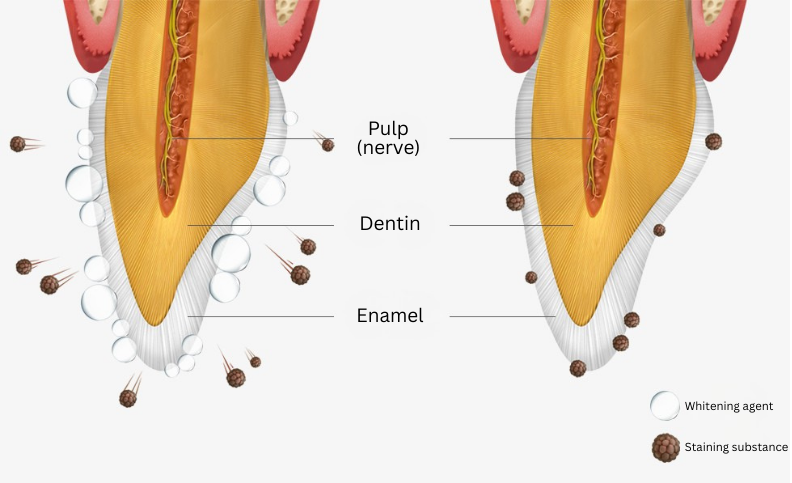 The whitening effect occurs by using hydrogen peroxide as a whitening agent to break down the molecular structure of stains inside the teeth, resulting in a whitening effect.