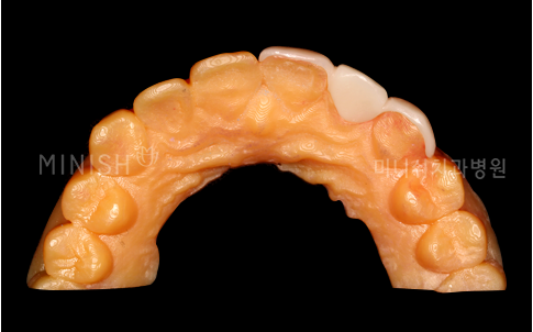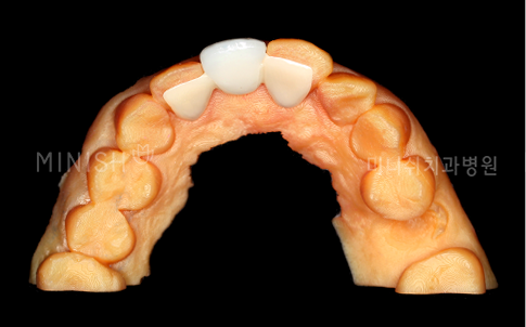 In cases where the adjacent teeth, in addition to the missing tooth, show wear, erosion, or decay and require enamel reconstruction, only the problematic areas are selectively removed. A MINISH veneer–type prosthesis is then fabricated as a single unit, connecting the artificial tooth (pontic) that replaces the missing tooth with the restorations covering the damaged portions of the adjacent teeth.